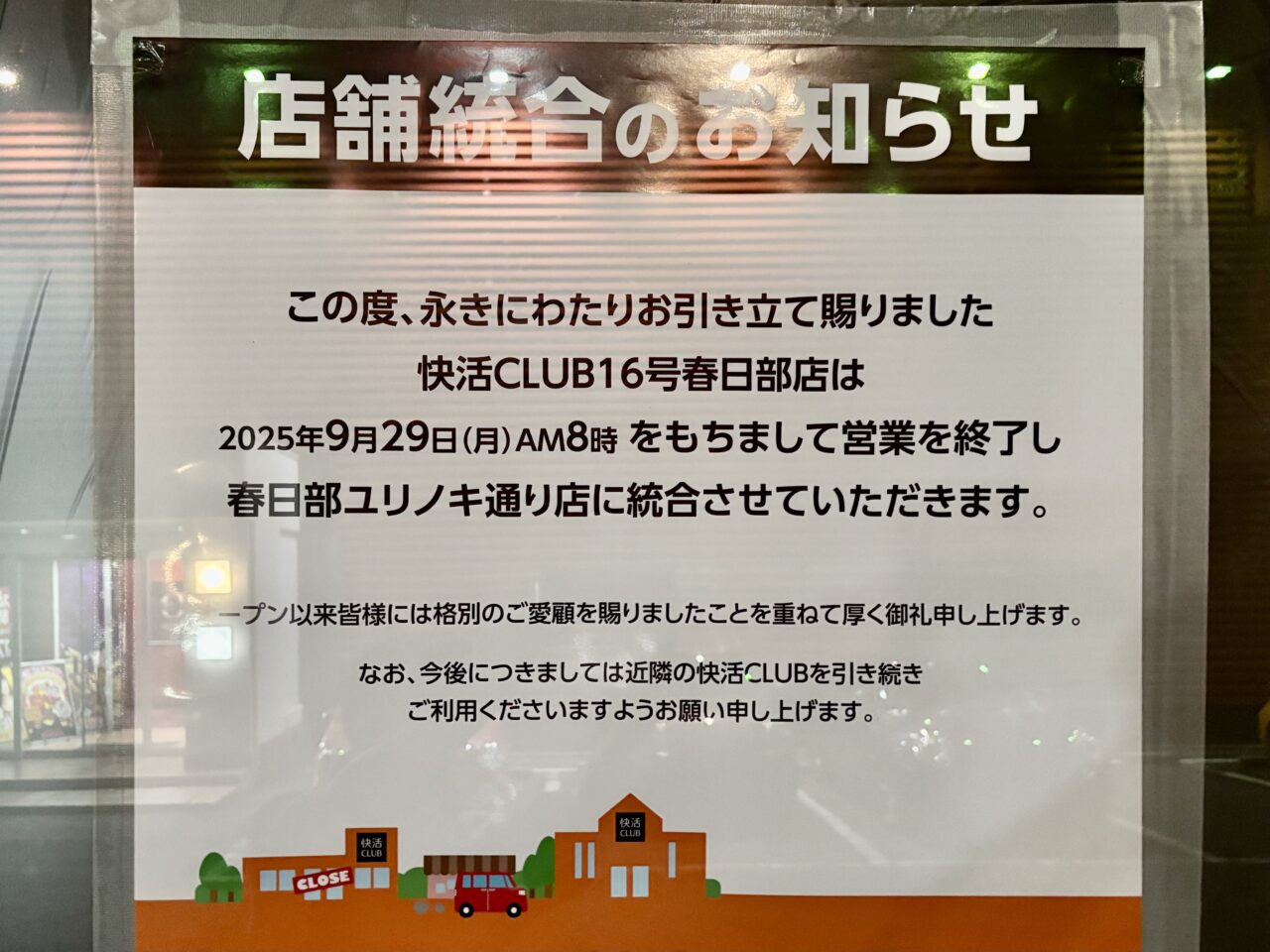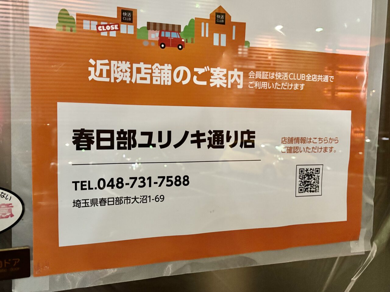 今後は「快活CLUB 春日部ユリノキ通り店」に統合されるとのことです。