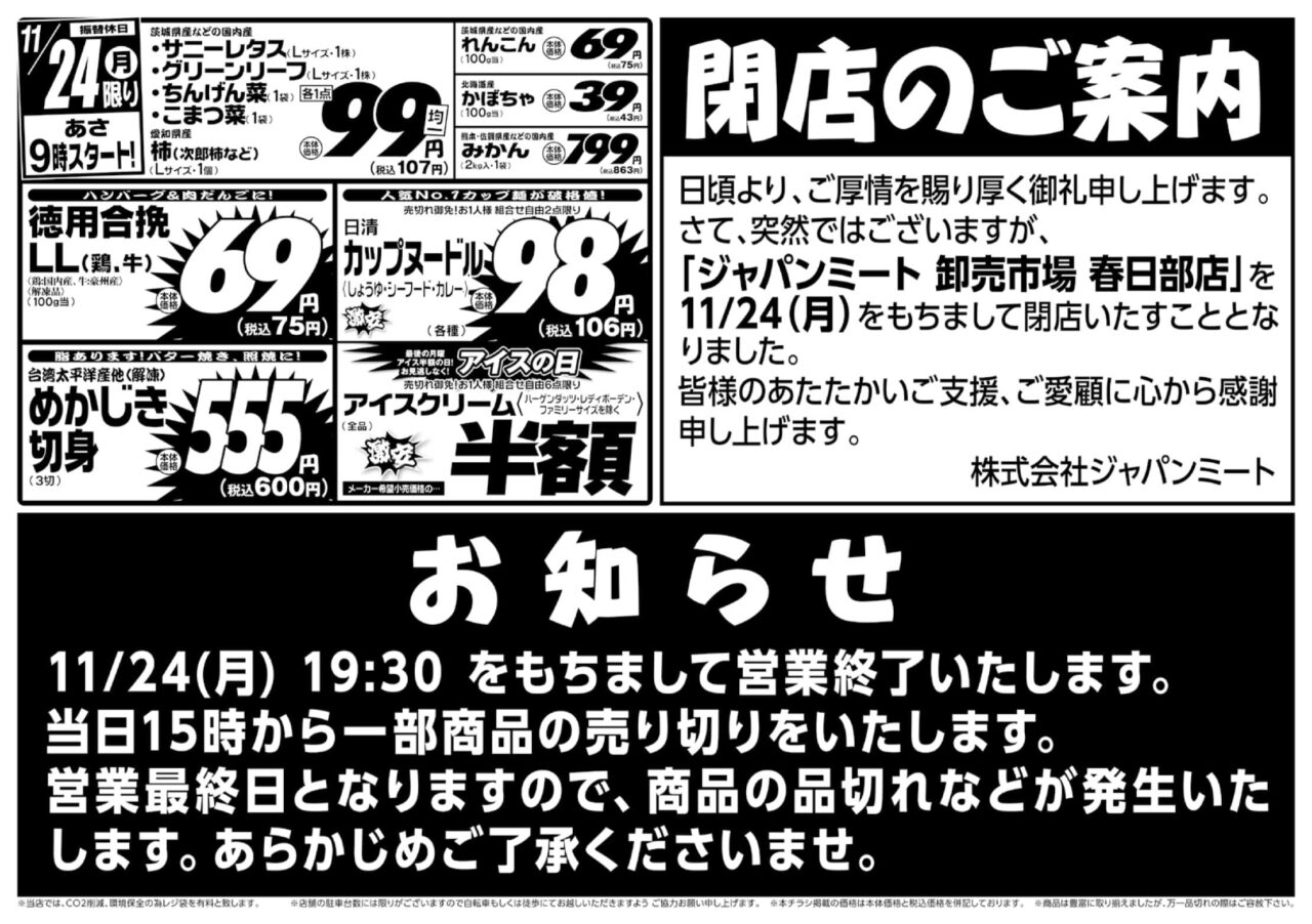 実際に店舗へ行ってみると、チラシに「2025年11月24日(月)で閉店」との案内が掲示されていました。この時の店内は閉店セールの様子もなく、通常通り買い物ができる状態でした。