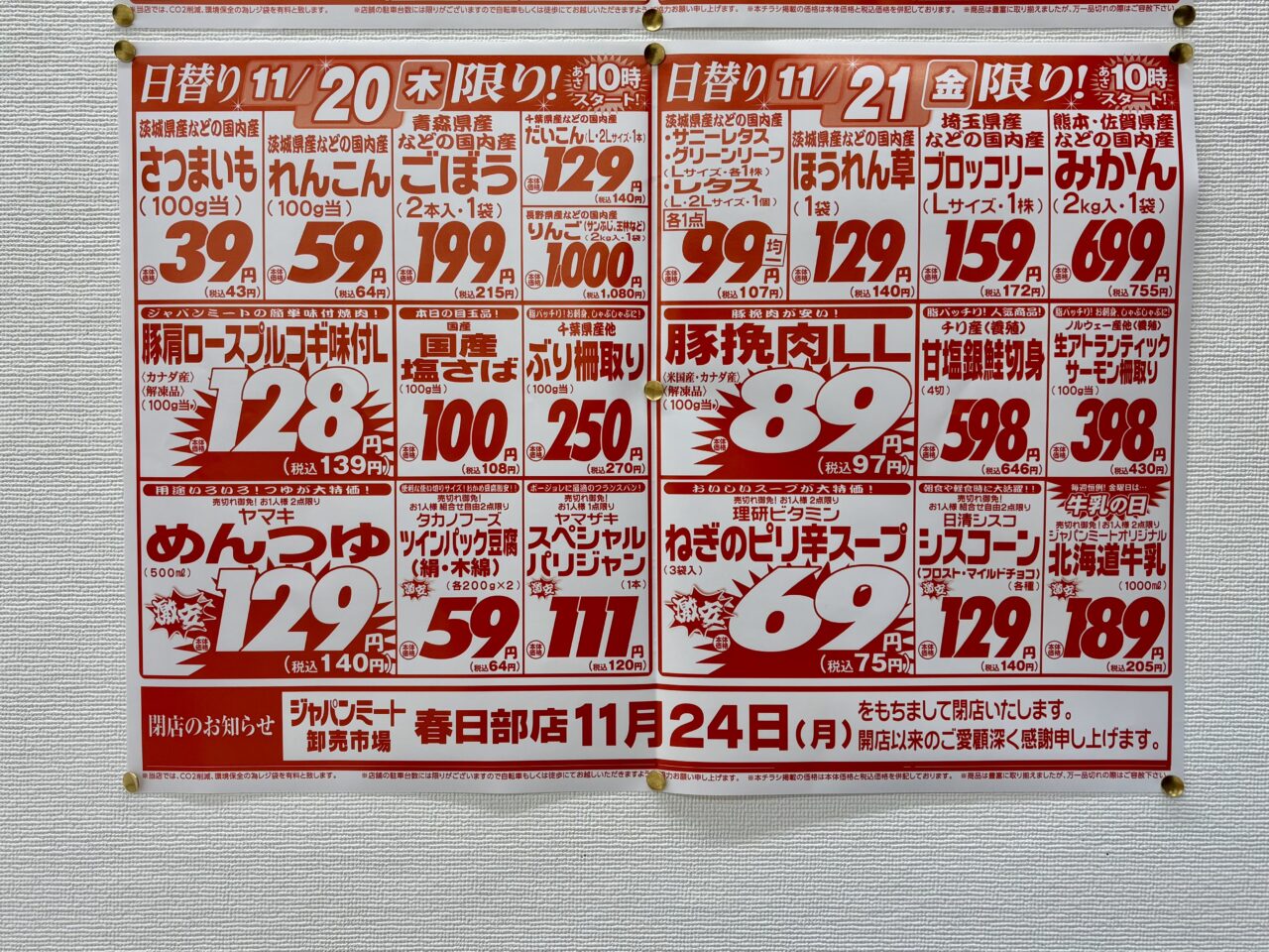 【春日部市】衝撃 「ジャパンミート卸売市場 春日部店」が11月24日で閉店。オープンからわずか5か月