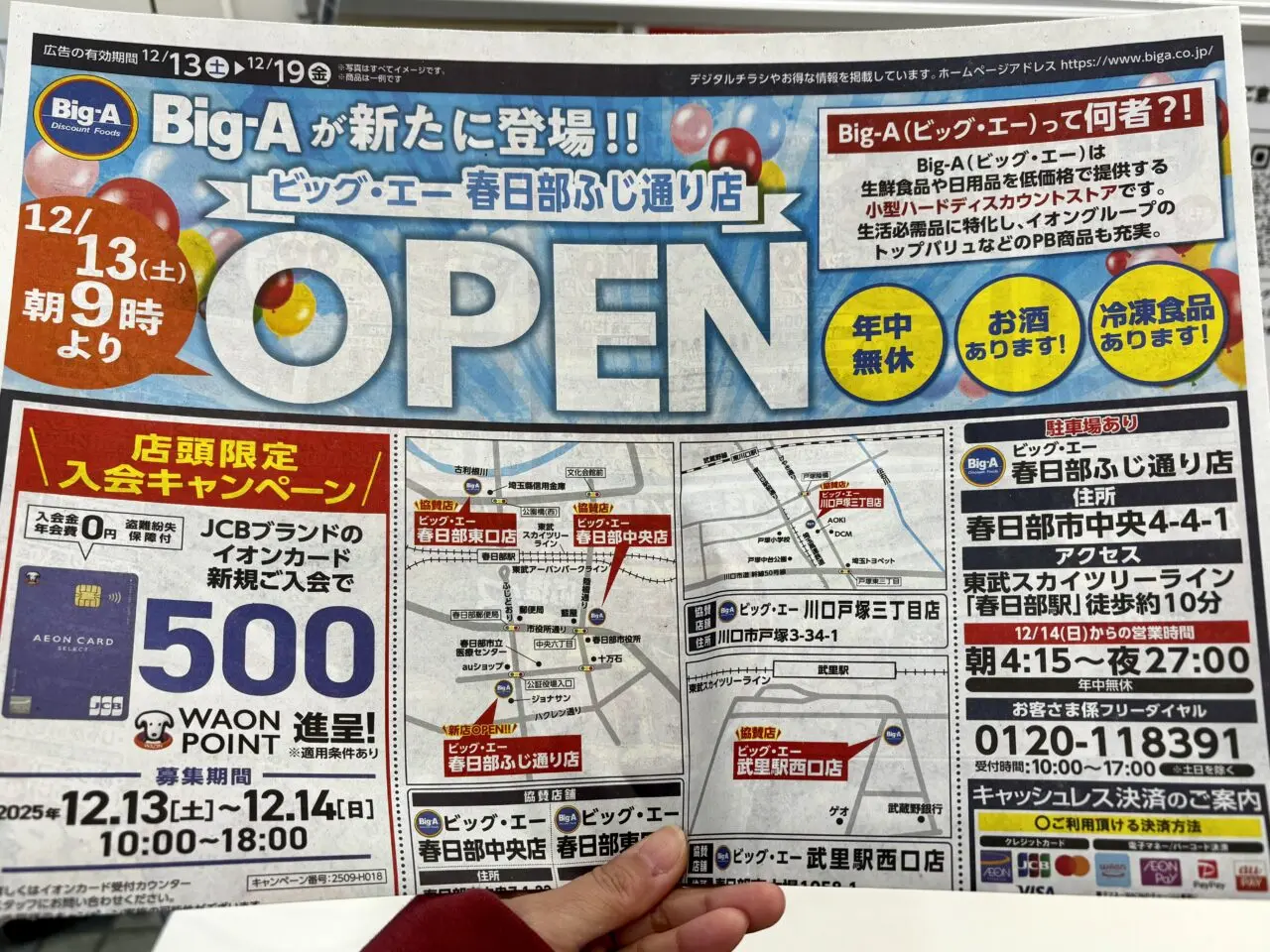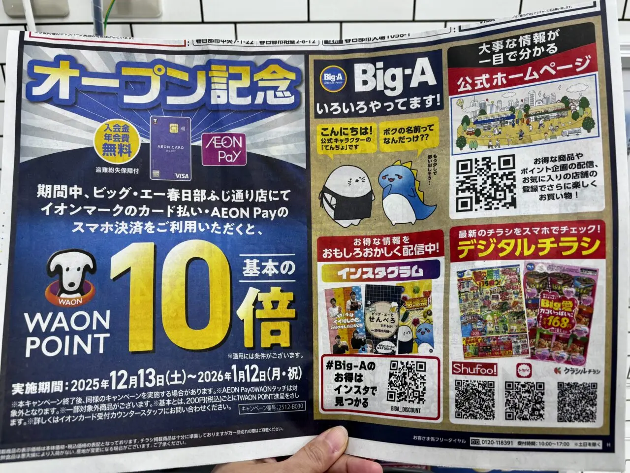 また、オープン記念で「ビッグ・エー春日部ふじ通り店」でイオンマークのカード払い、またはAEON Payのスマホ決済を利用すると、WAON POINTが10倍になるキャンペーンも行われていました。(2026年1月12日まで)