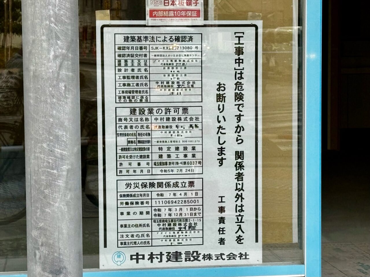 建物の前には現在もカラーコーンが並び、「工事中」の表示が掲示されていました。掲示物によると、建築基準法による確認を受けた建物で、建設業者や工期などの情報が記載されています。