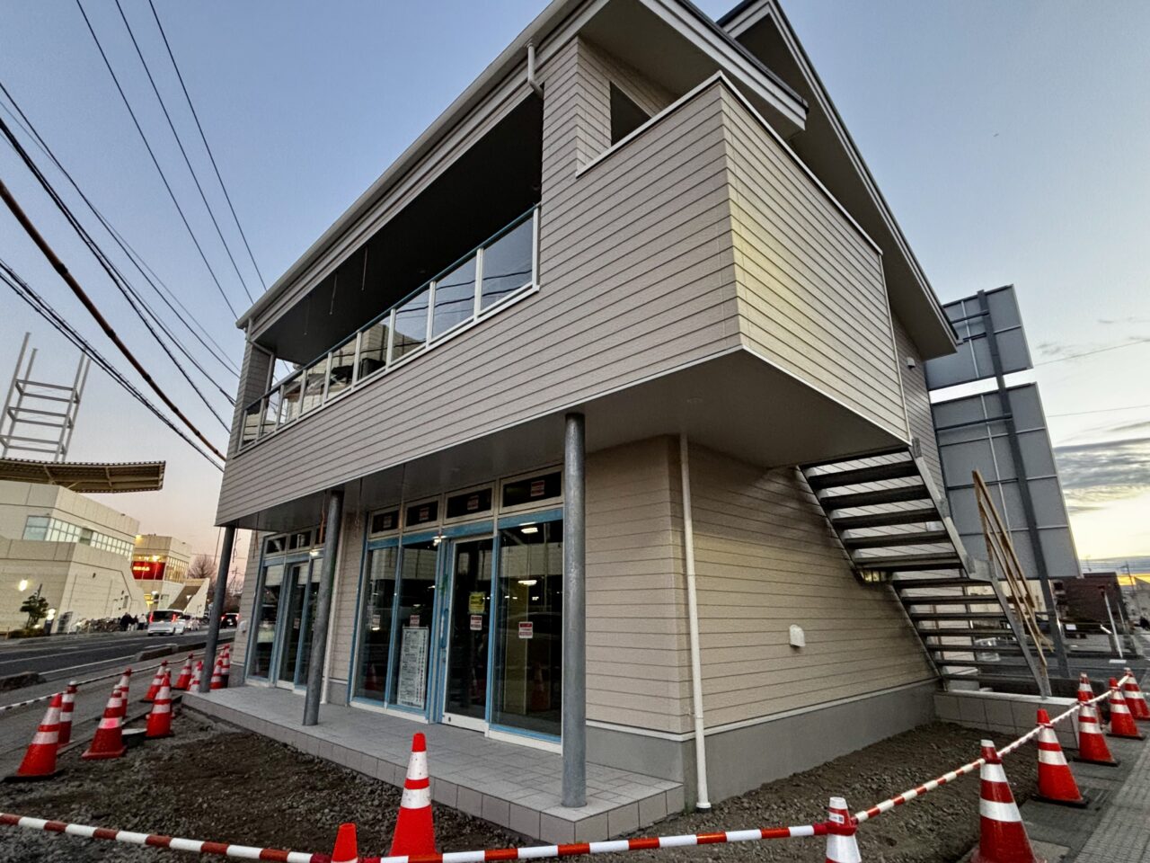 現地を見てみると、2階建ての比較的コンパクトな建物で、道路側は1階・2階ともに大きな窓が設けられています。外観からは、店舗としての利用を想定したつくりであることがうかがえます。