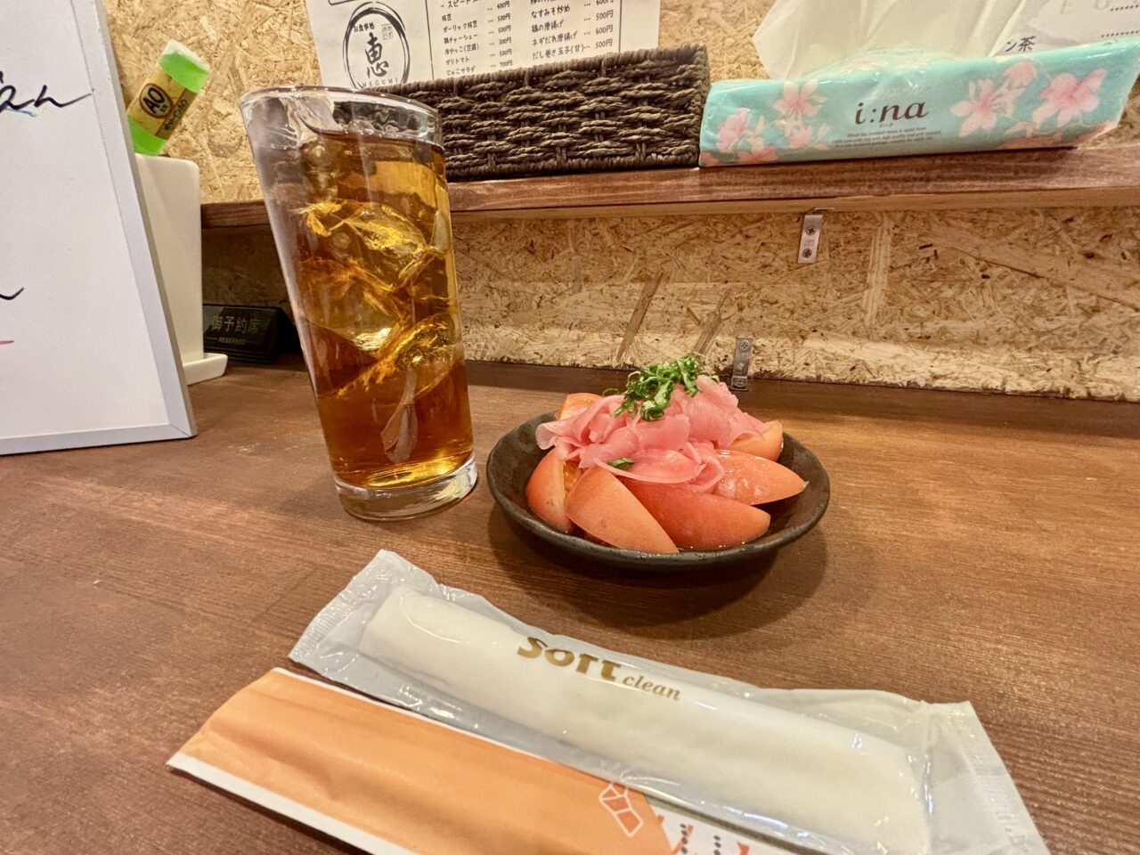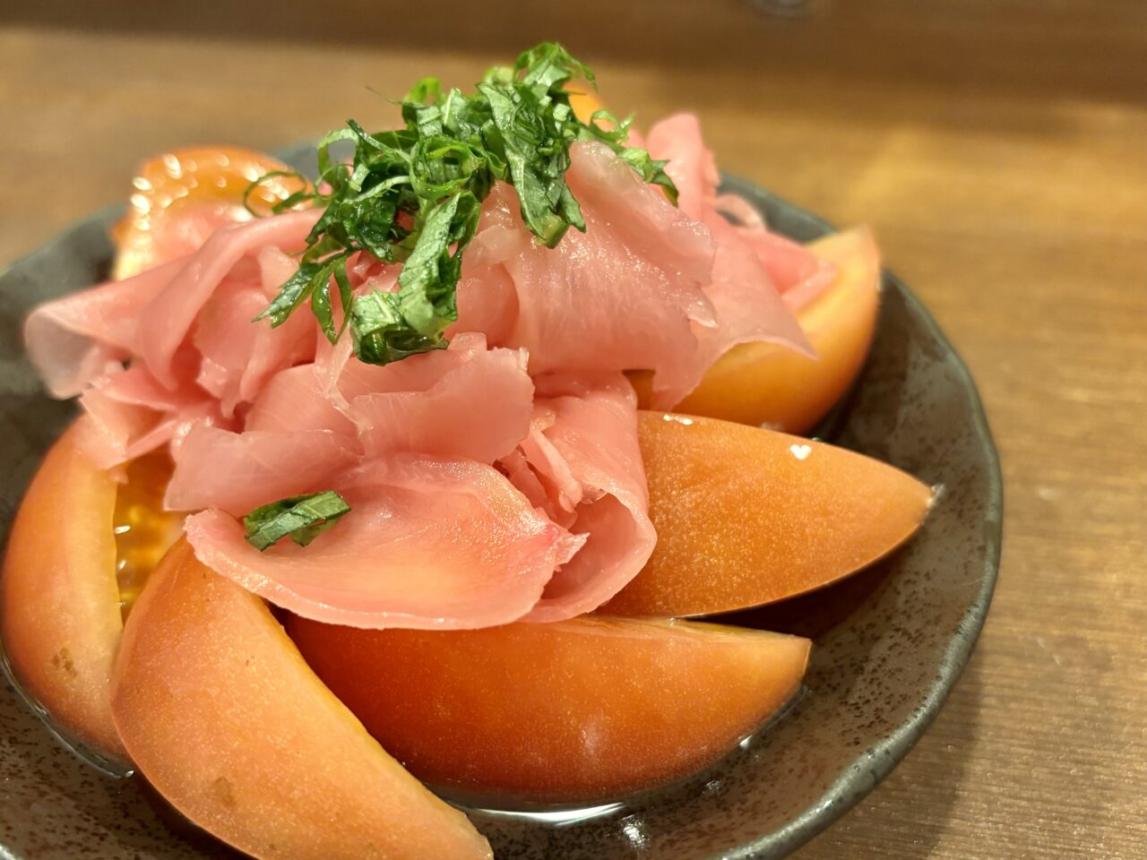 お皿が運ばれてきて驚いたのが、ガリの量。トマトの上にたっぷりと乗せられています。一口食べると、甘辛いガリの味とトマトの酸味が意外なほど相性抜群。