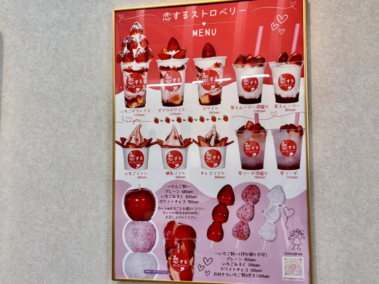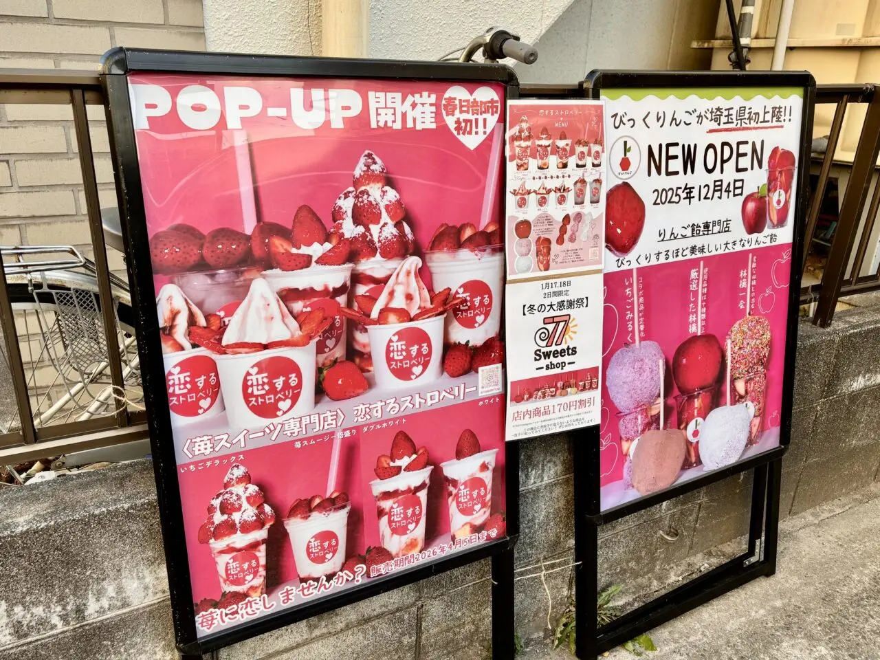 店頭には、苺を贅沢に使ったスイーツが並んだ立て看板が設置されており、思わず足を止めてしまう華やかさ。お隣には、2025年12月4日から販売されているりんご飴専門店「びっくりんご」の立て看板も並んでいました。