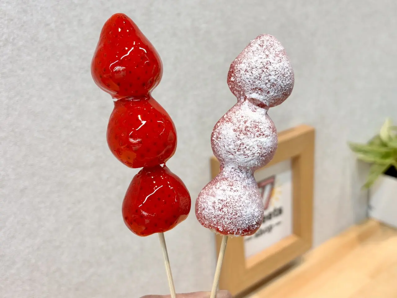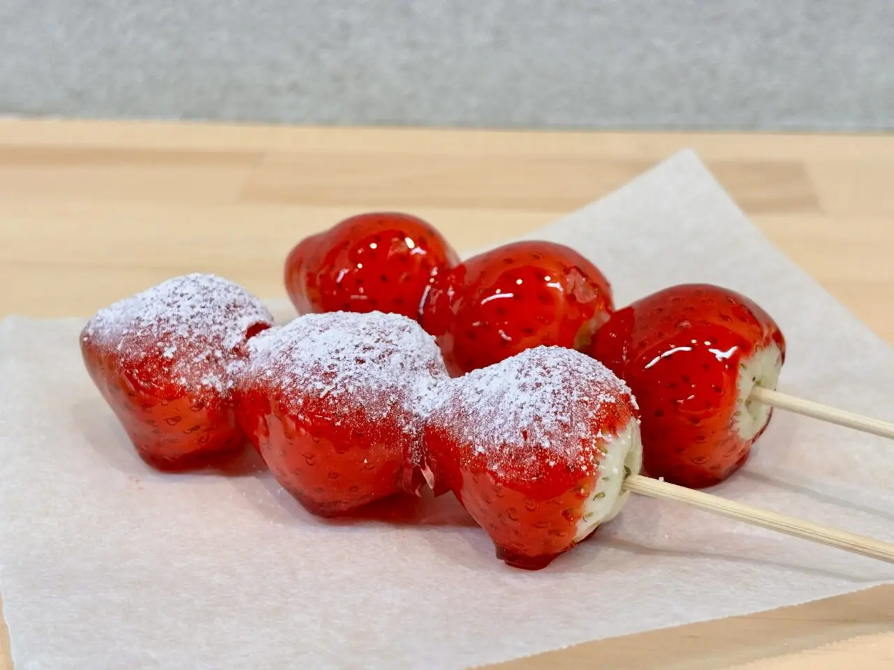 「いちご飴」は、つやつやにコーティングされた見た目が印象的。