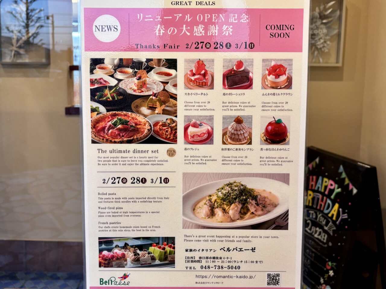春日部市備後東4丁目、旧国道4号線沿いにある人気イタリアン「ベルパエーゼ春日部店」が、2026年2月6日にリニューアルオープンしました。