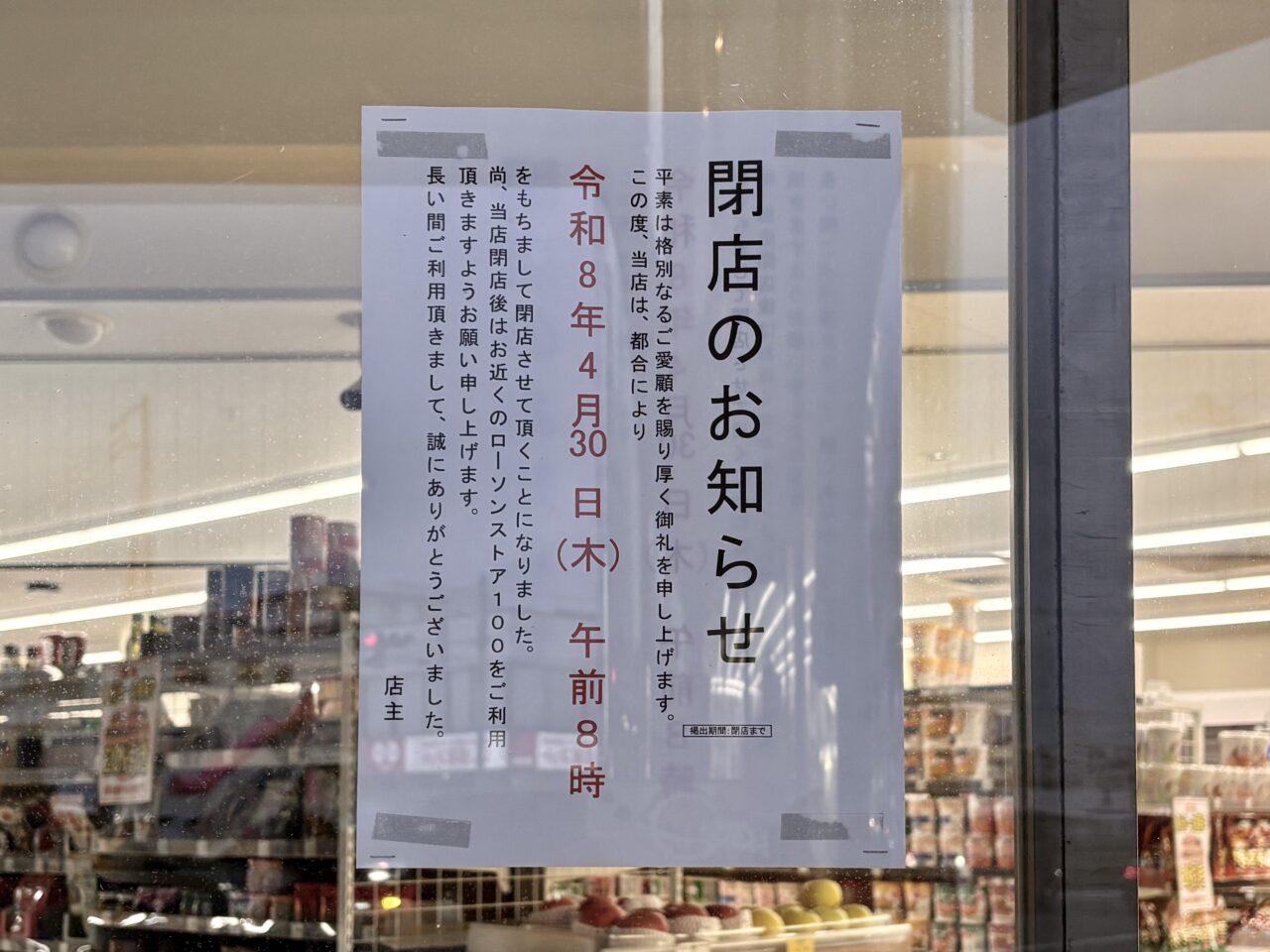 2026年4月15日ごろに実際に訪れてみると、店舗の入り口や店内には閉店のお知らせが掲示されていました。