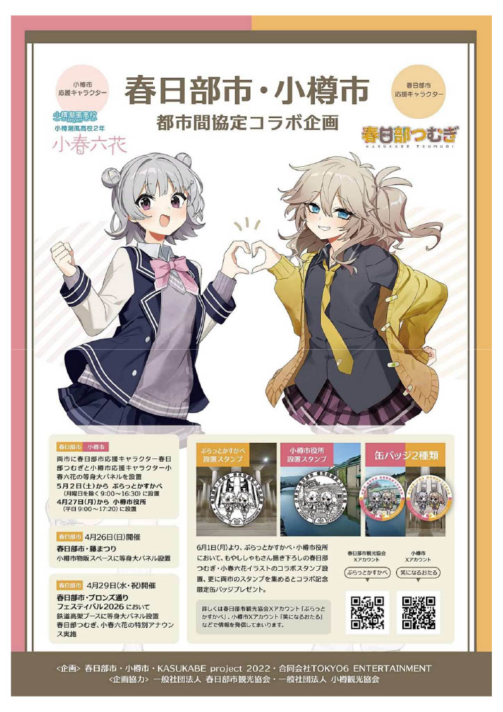 春日部市内では、2026年4月26日(日)開催の「藤まつり」の小樽市物販スペース、4月29日(水・祝)開催の「ブロンズ通りフェスティバル2026」の鉄道高架ブースに、春日部つむぎと小春六花の等身大パネルが登場予定です。